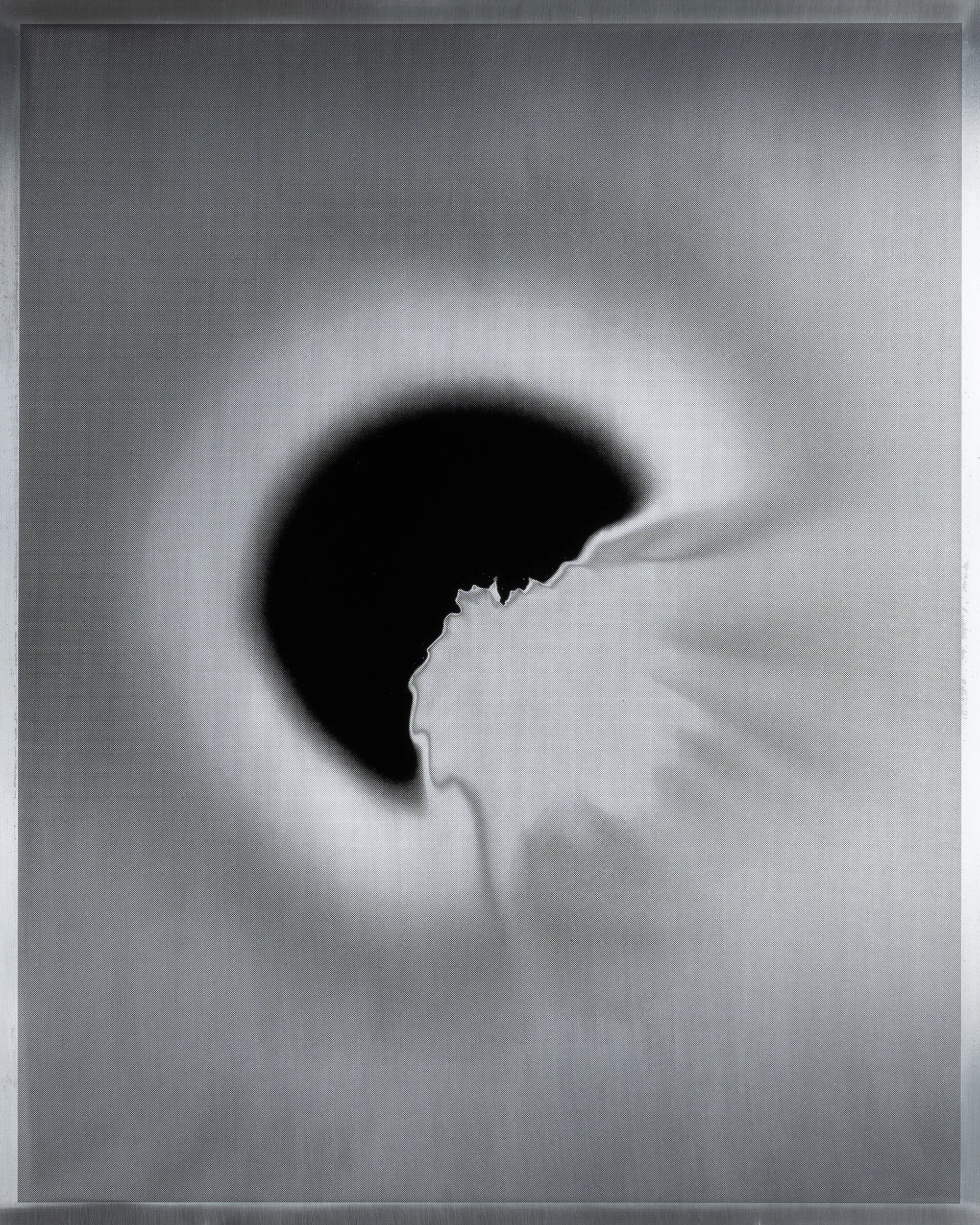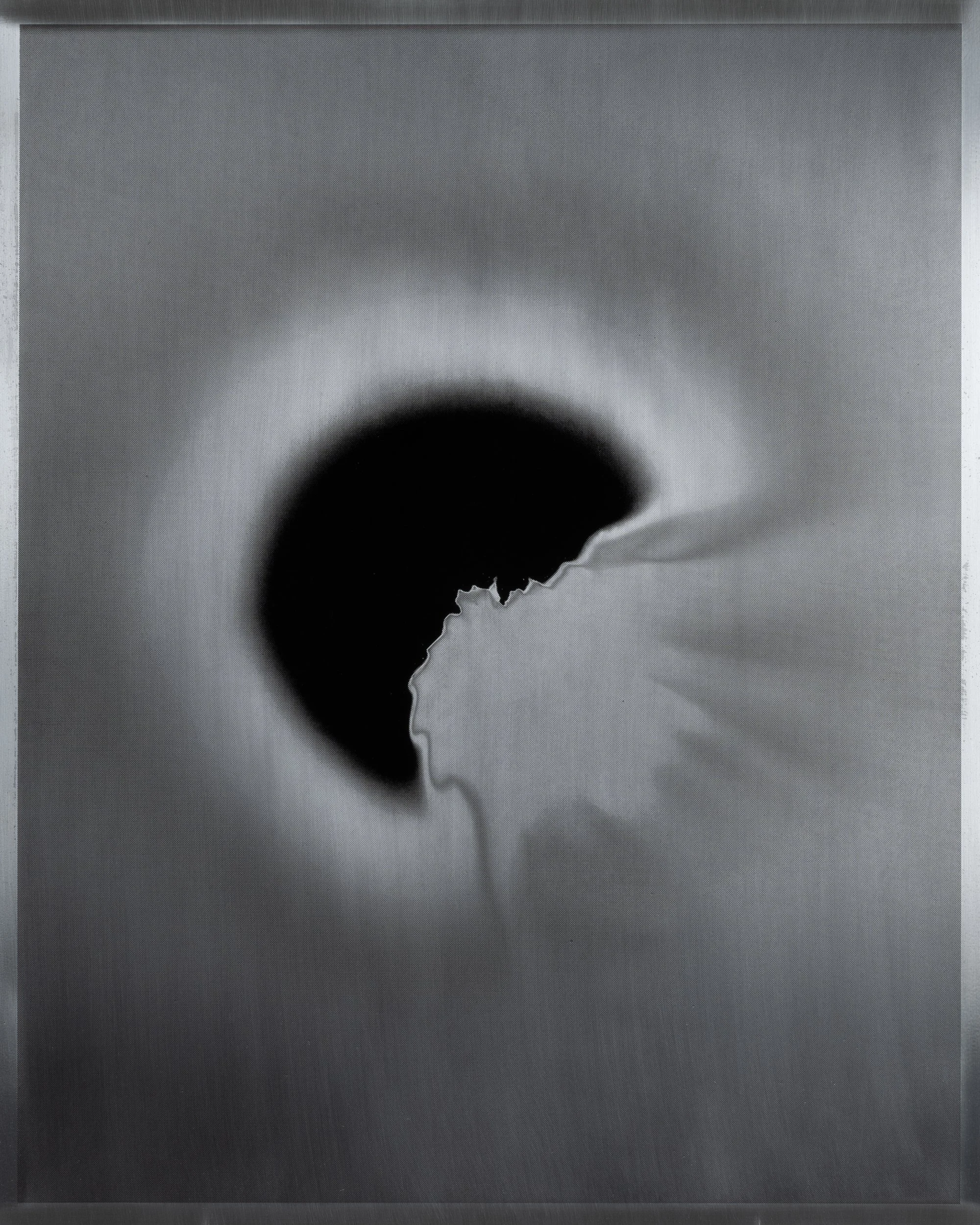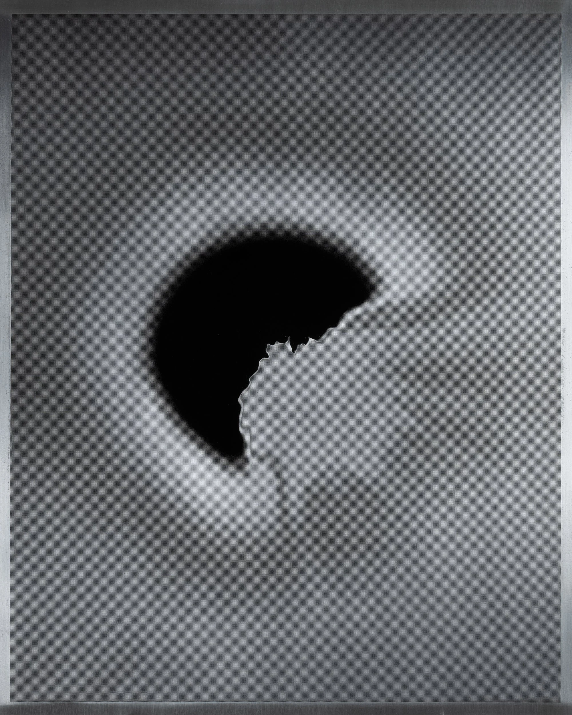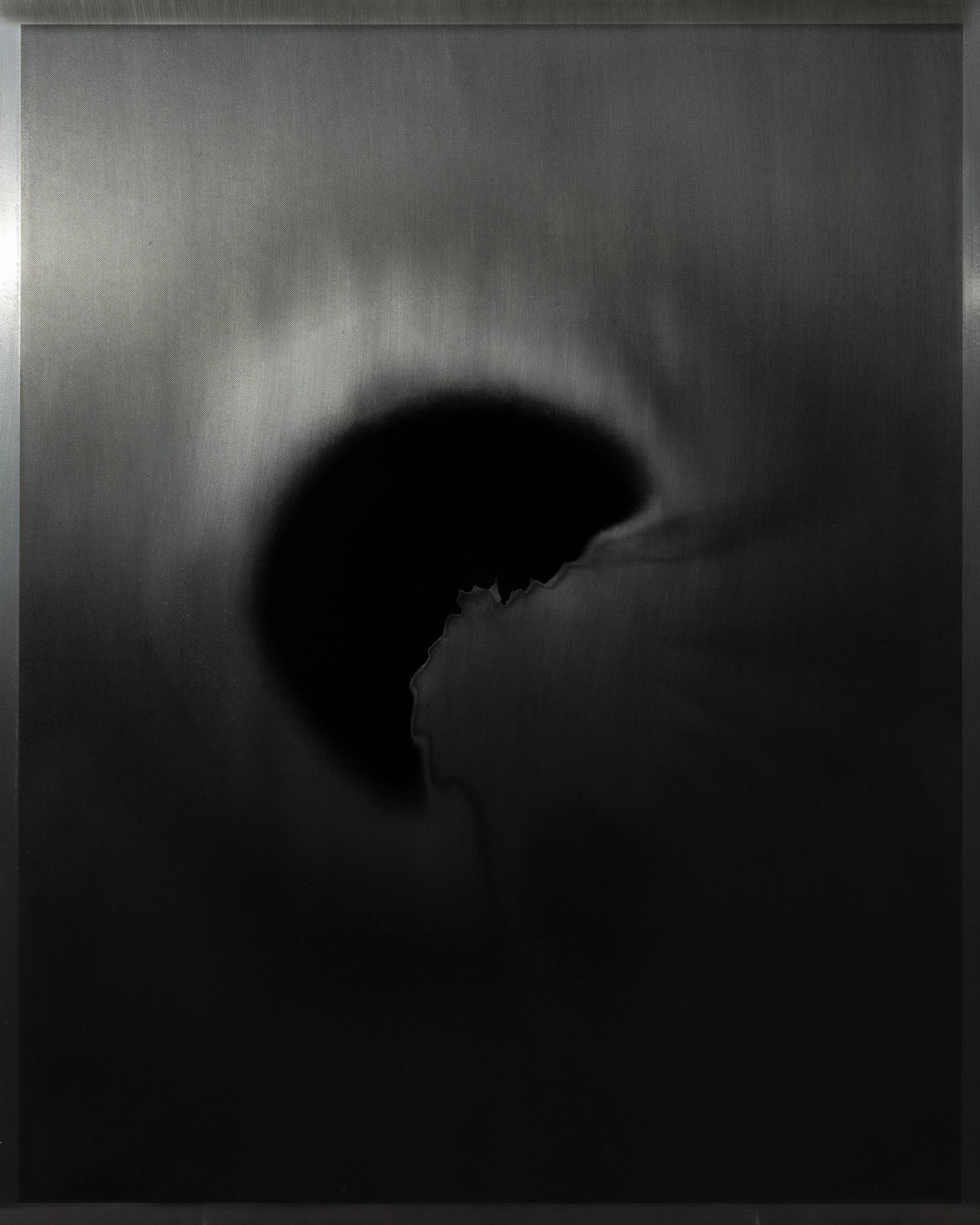 These etched zinc panels are created using two kinds of pinecones from two very different trees—the lodgepole pine that is ubiquitous across thousands of acres of the pacific northwest, and the critically endangered Torrey pine that survives only in the coastal regions around San Diego. The reproductive needs of these trees are diametrically opposed: The lodgepole pine cone matures to be encased in a resin and requires forest fires in order to break the seal and release their seeds. However, the Torrey pine is now under constant threat of extinction from wildfires that rampage across California. I grew up between California and Montana, and witnessed both the need for and fear of fire, so I turned to the darkroom to create traces of these trees. Like the creation of miniature universes, I set cones ablaze on silver gelatin paper, leaving only a trace fixed among silver halide crystals. To permanently affix these ghostly visions, I translated the images into etched zinc plates. What is seen is only metal, either raw or patinated, preserved under a coat of lacquer.